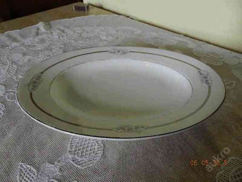 Průměr velkého talíře 28,5cm, výška 4cm, průměr hlubokého talíře 23cm, výška 4cm, mělký 23cm (4 kusy).