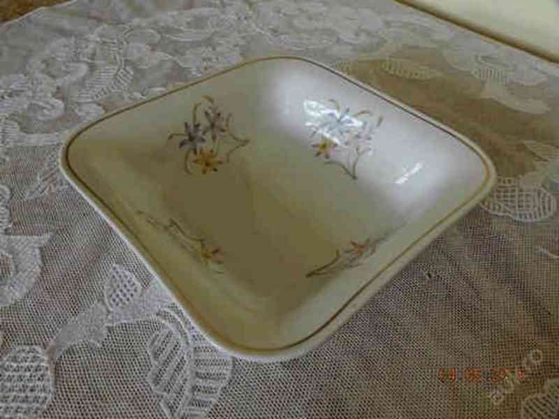 Výška teriny 21cm, délka 35cm, omáčník výška 10cm, délka 19,5cm. Oválný tác délka 33,5cm, šířka 23,5cm, malý tácek délka 21cm, šířka 14cm, mísa čtverhranná 23,5cm, mísa hluboká 25cm, výška 6,5cm, talíř 23,5cm.