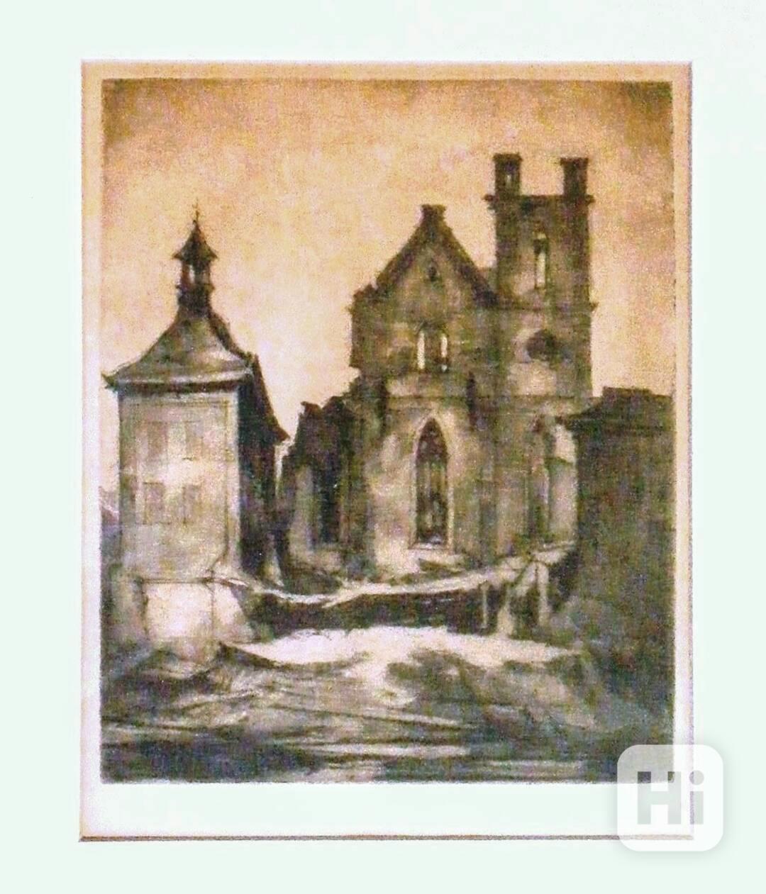 Prodám grafiku Karla Gabriela: Emauzy po náletu, signováno 1948, rozměr 40x30 cm, nerámováno.