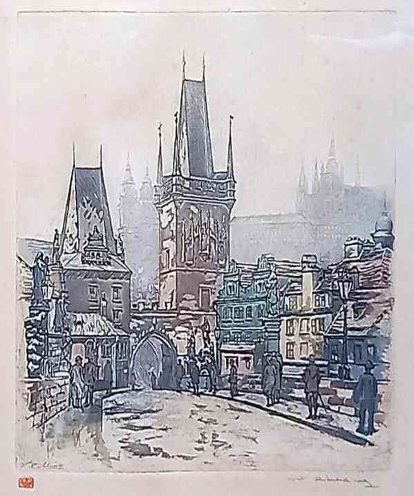 Prodám originální barevný lept od Vl.Röhlinga: Malostranské mostecké věže, rozměr 22x22 cm, nerámováno.