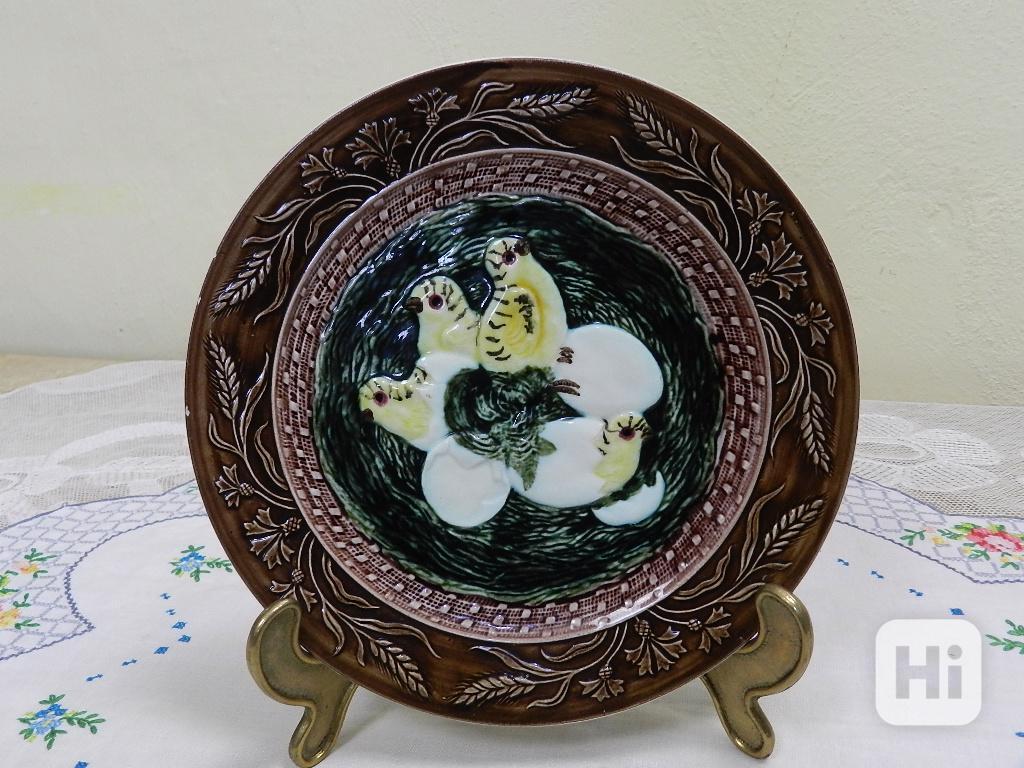 Secesní dekorační Talíř Kuřátka Vajíčka Majolika Značeno