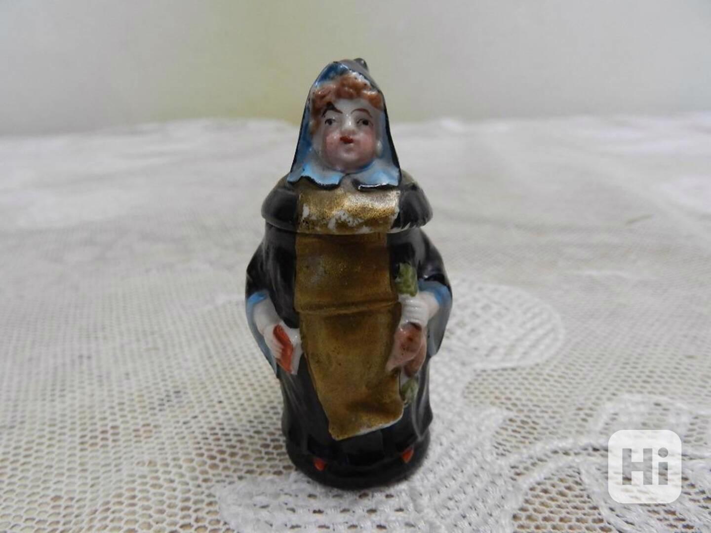 Vzácný velmi starý porcelánový mini korbel s mnichem.