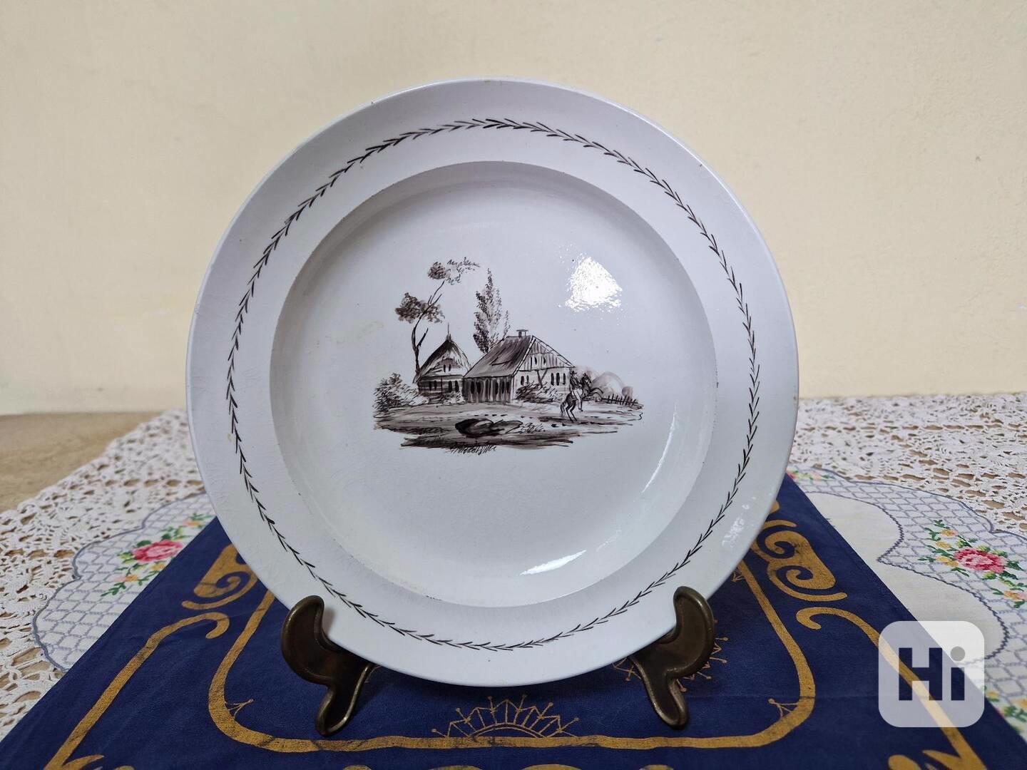 Zajímavý kameninový Talíř, kvalitní ruční malba, Ranč - Stará Role A. Nowotny Carlsbad,1 třetina 19stol.