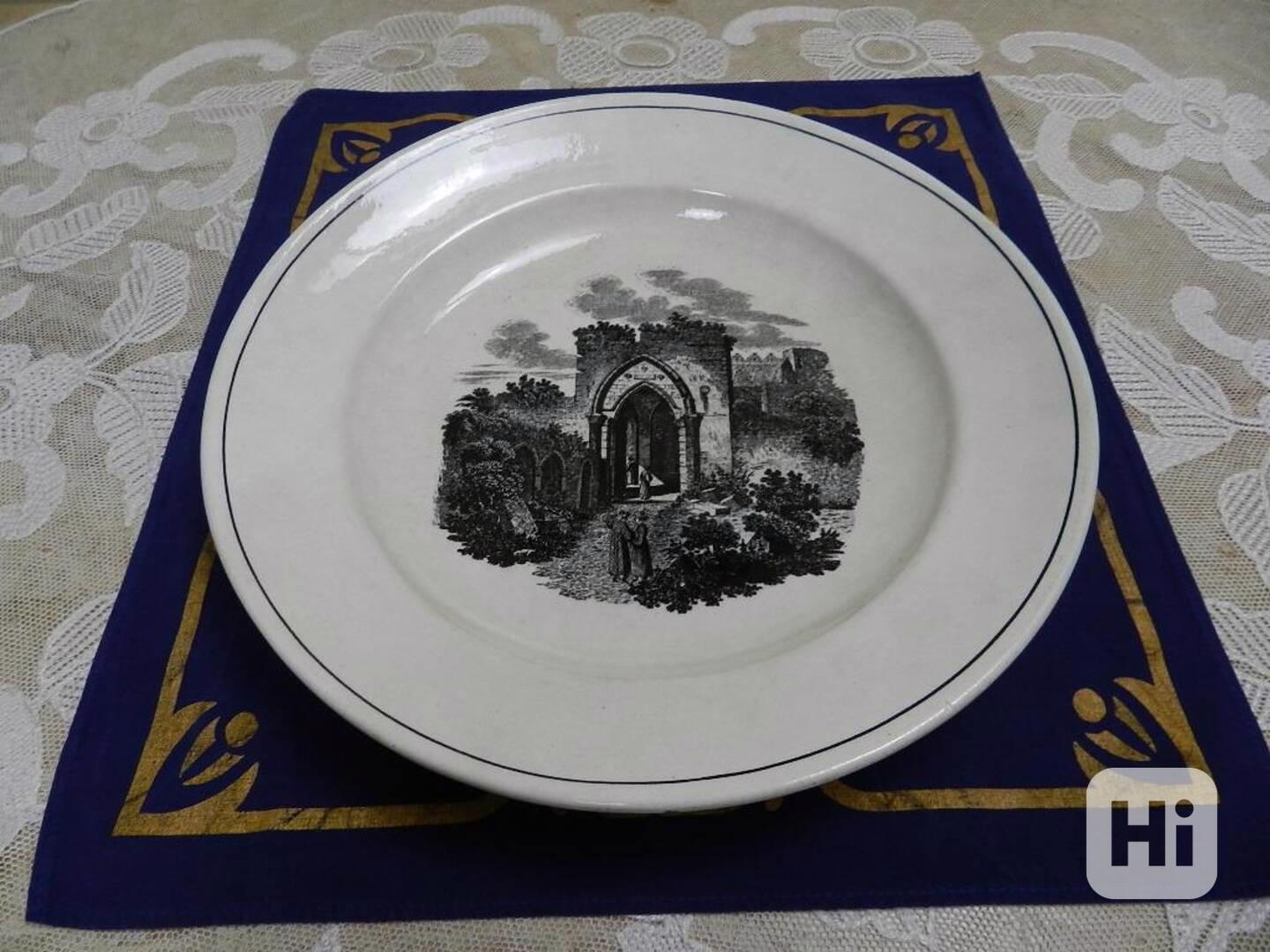 Dekorační velmi starý kameninový Talíř s hradem, top stav - A. Nowotny Altrohlau, Stará Role, kolem 2 třetiny 19 stol.