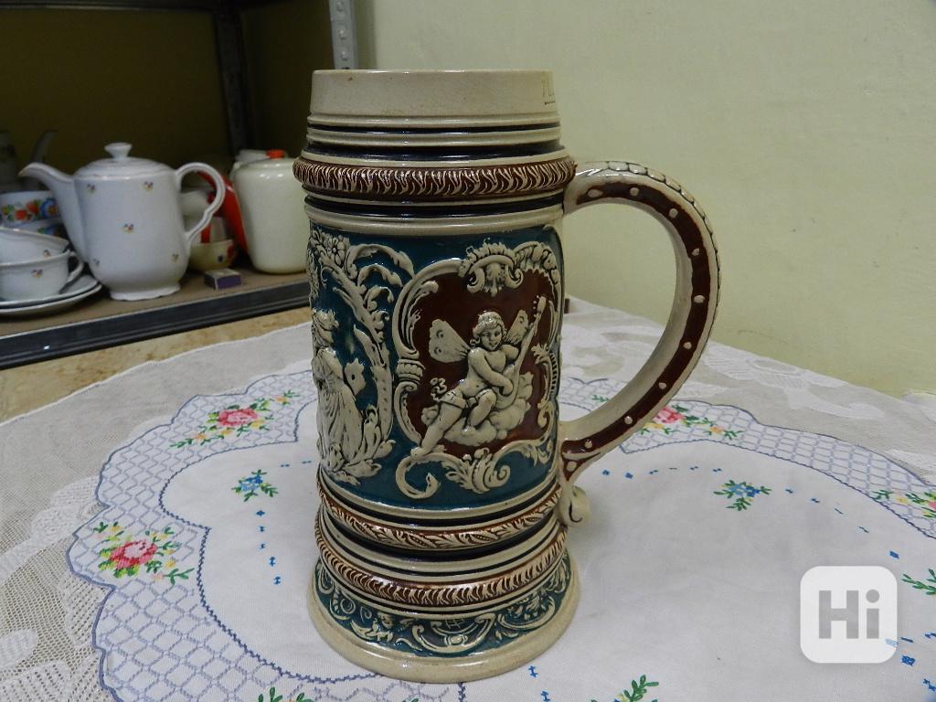Krásný starý obří bohatě zdobený keramický Korbel Andělíčci