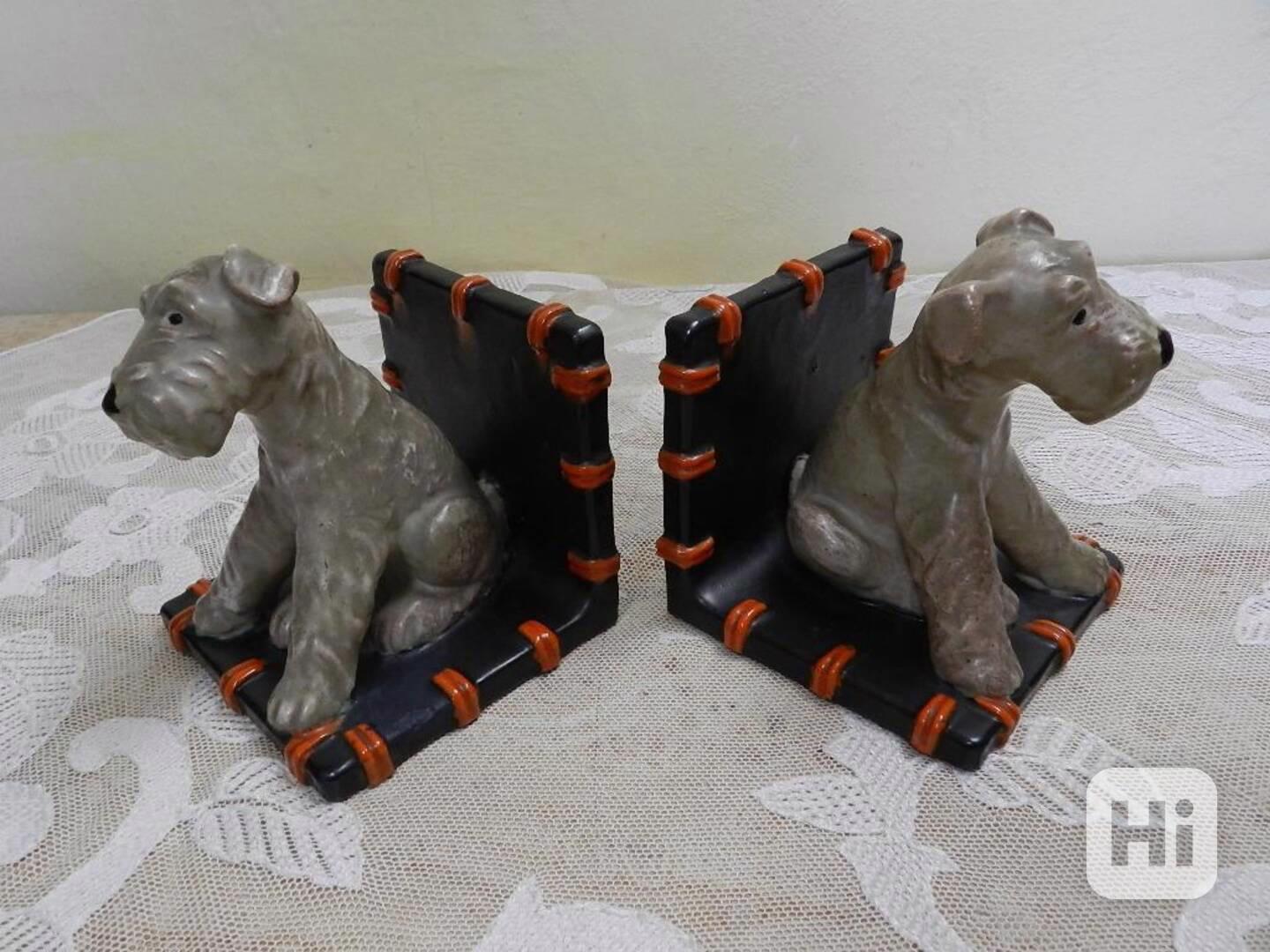 Stylové figurální zarážky na knihy se psy, glazovaná malovaná terakota, velmi kvalitní zpracování - Značeno + původní štítek prodejce, Ant. Mayer Keramik Rakousko, 1 třetina 20stol.