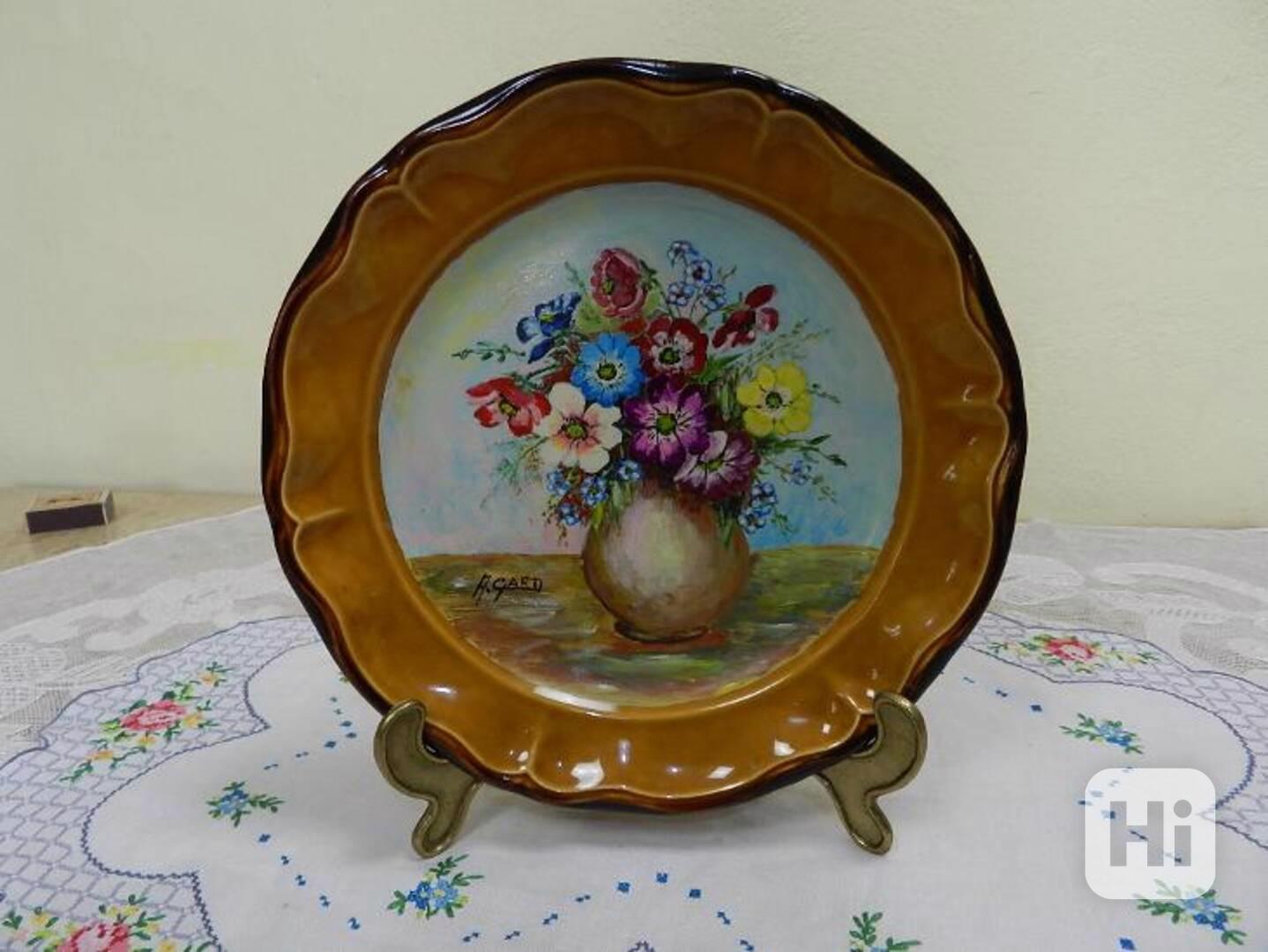 Hezký starý ručně malovaný dekorační Talíř, zátiší s květinami - Francie, Signováno.