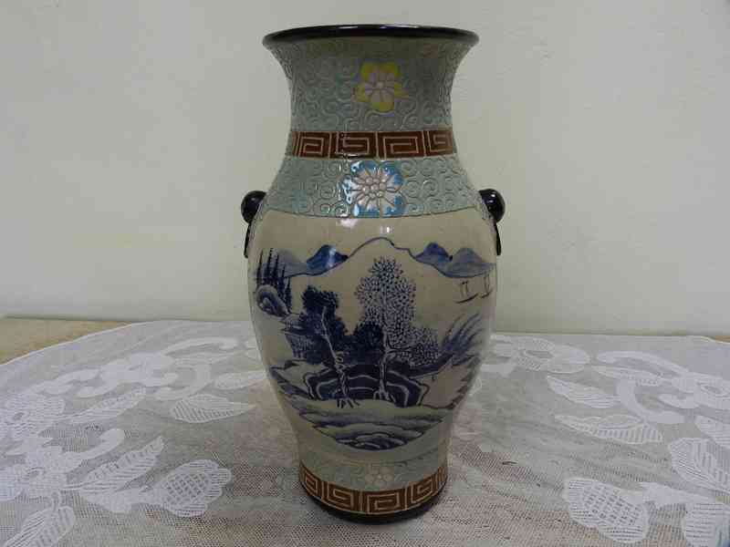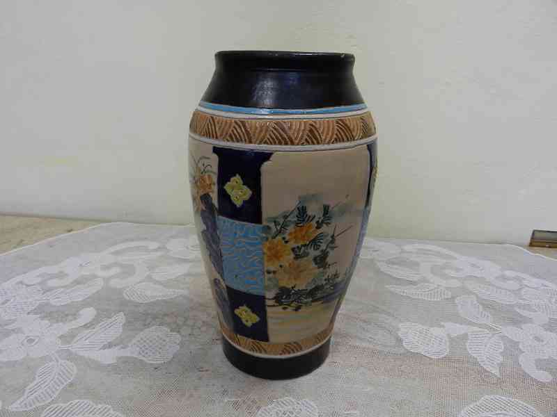 Krásná stará bohatě zbobená ručně malovaná kameninová Váza, Značená.