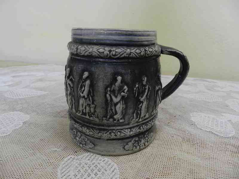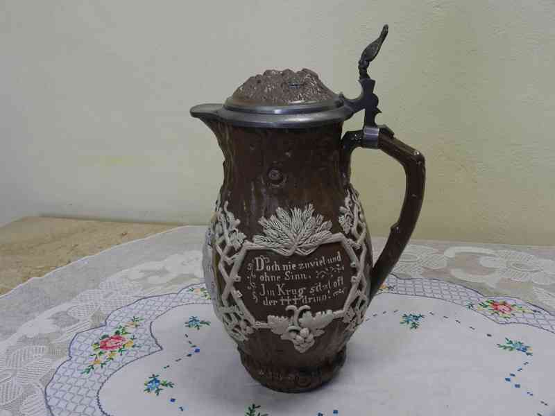 Krásný secesní masivní Džbán s poklopem, bohaté zdobení, reliéf, pořekadlo - Villeroy Boch Mettlach, kolem 1890.