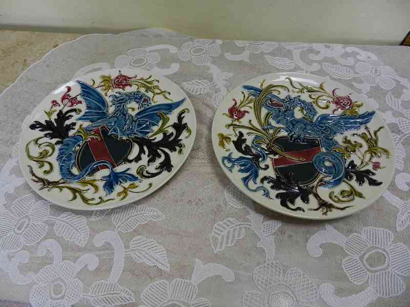 Luxusní bohatě plasticky zdobené malované obří talíře s Draky, majolika - RDZ Ditmar Znaim, 2 pol.19stol.