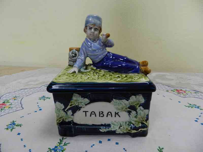 Krásná secesní dóza na Tabák, ležící Chlapec, Majolika - Pravděpodobně Eichwald.