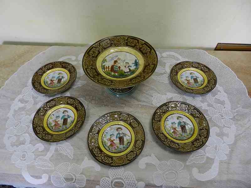 Krásný secesní Nástolec + 5 Talířků, ruční malba, Majolika - talířky značenz R.D.Z, Nástolec značen S.