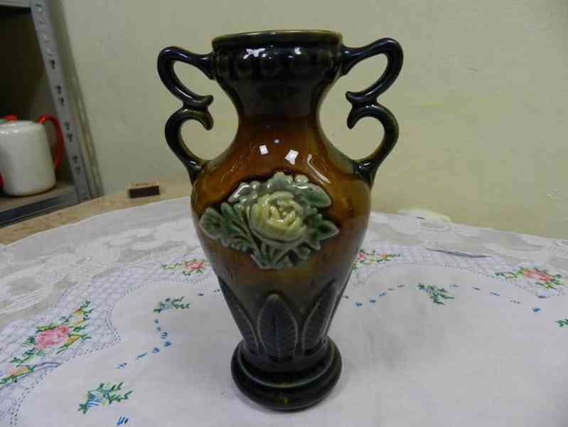 Hezká stará keramická Váza s plastickým motivem růže, Majolika.