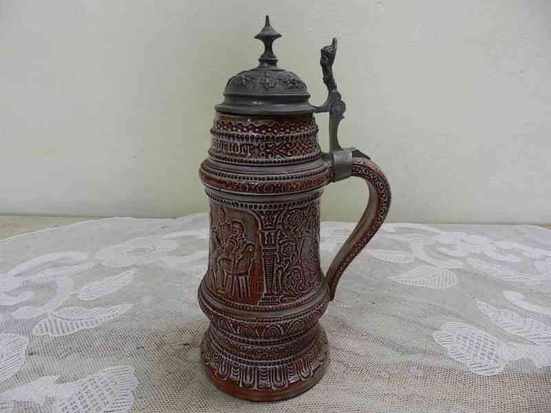 Hezký starý masivní keramický Korbel s poklopem, plastický dekor, kvalitní zpracování, uvnitř bílá poleva, Značeno, 1 pol. 20 stol.