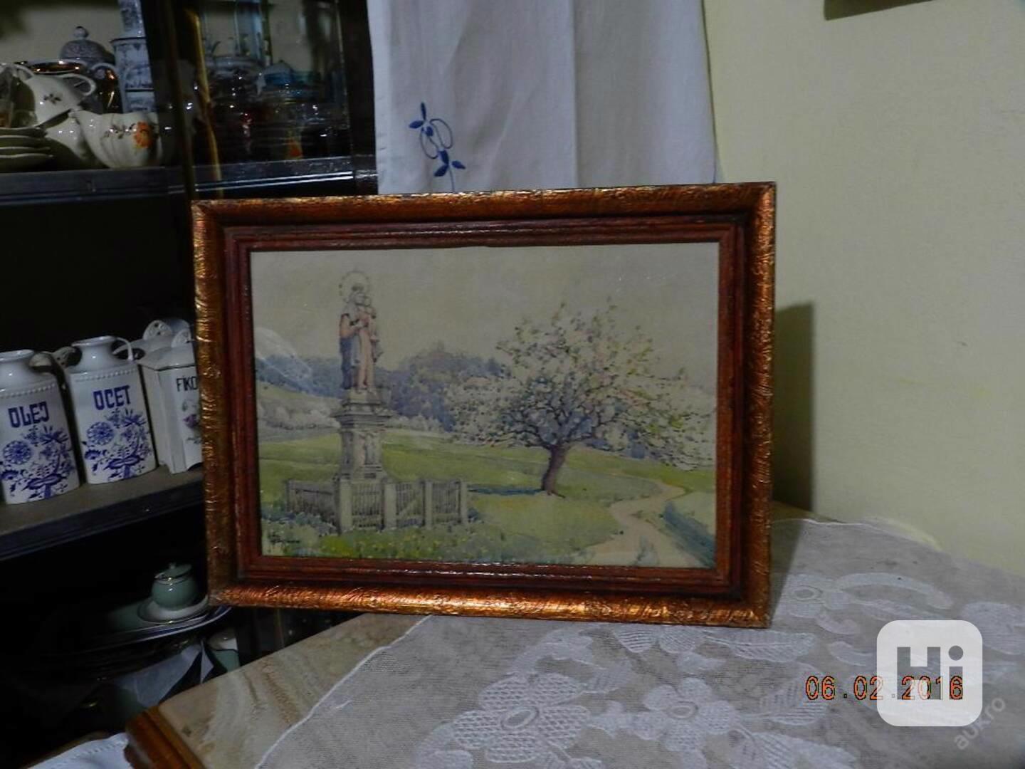 Nabízím krásný starý obraz - Letní Krajina, Boží Muka, Panna Marie - akvarel na kartonu, zaskleno.
