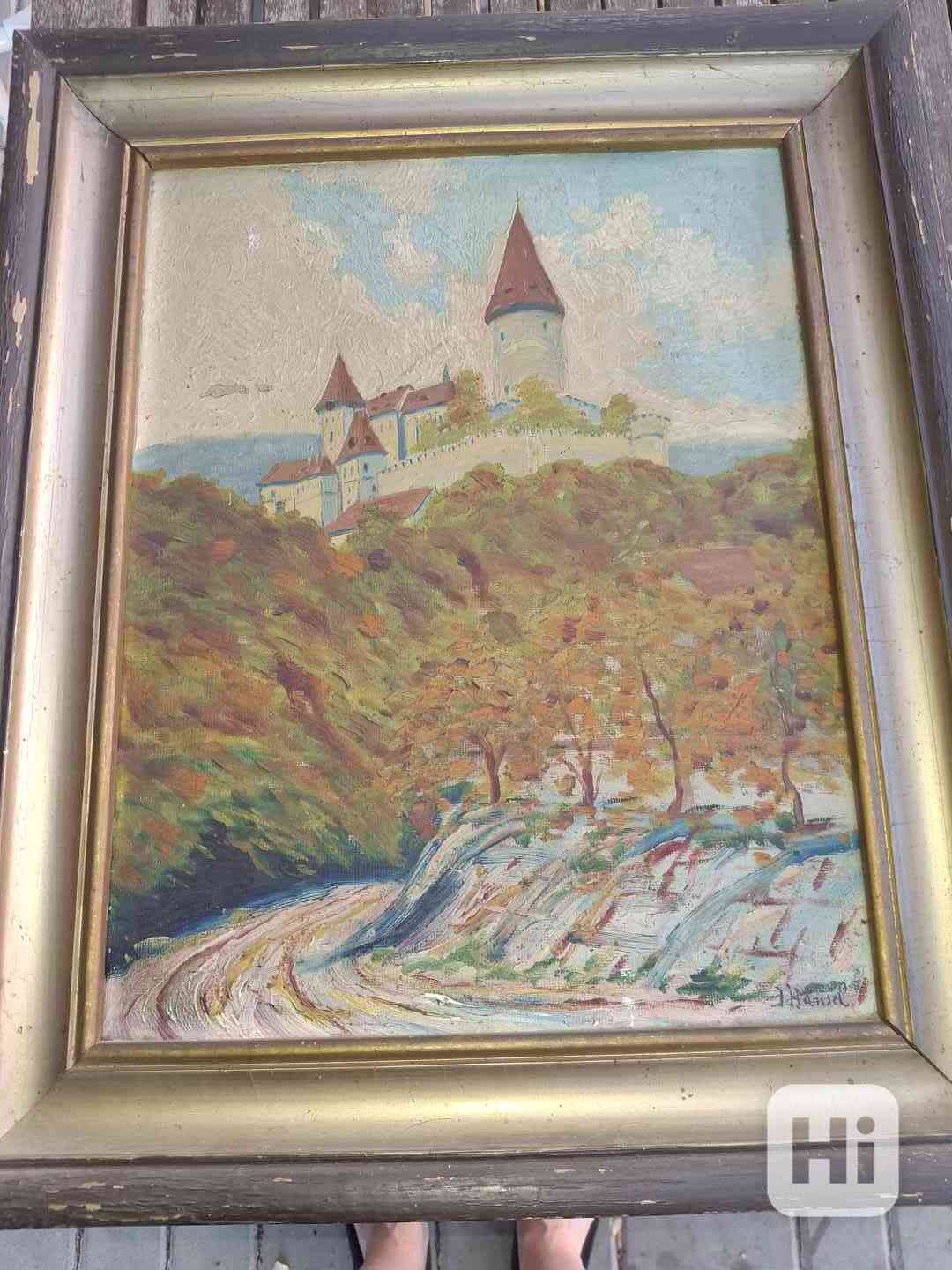 Motiv hradu Křivoklát v serpentinách – velmi pěkně zpracovaná krajina, výrazná barevnost a pastózní tahy štětcem.