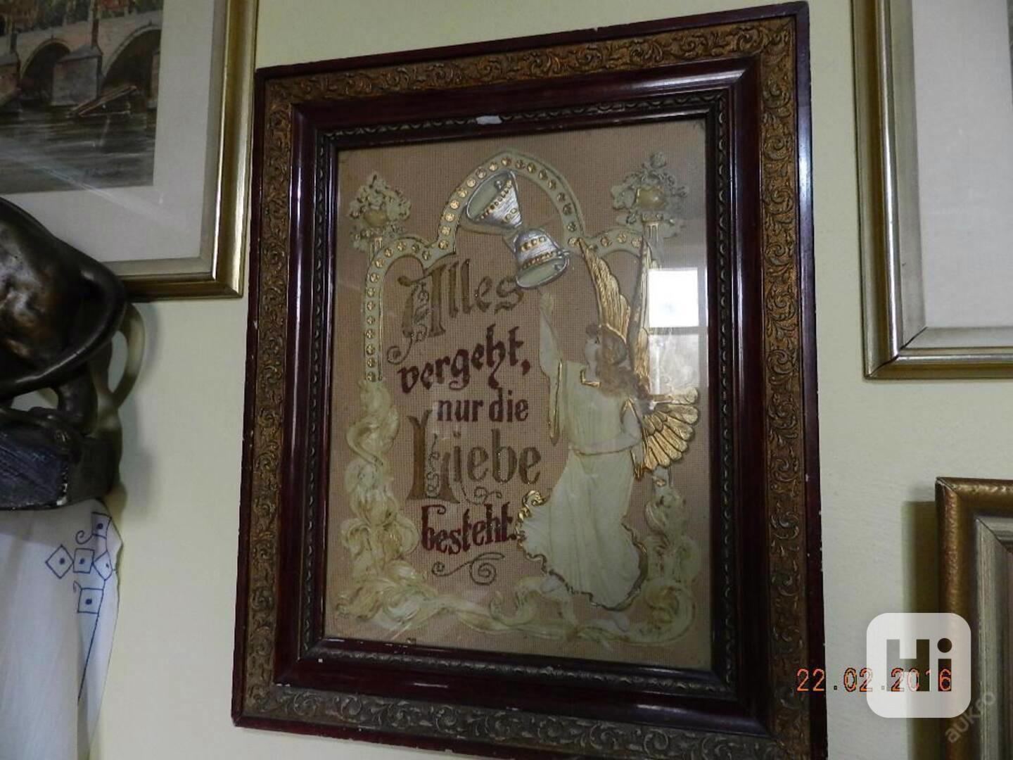 Krásný starožitný vyšívaný obraz Svatý Anděl
