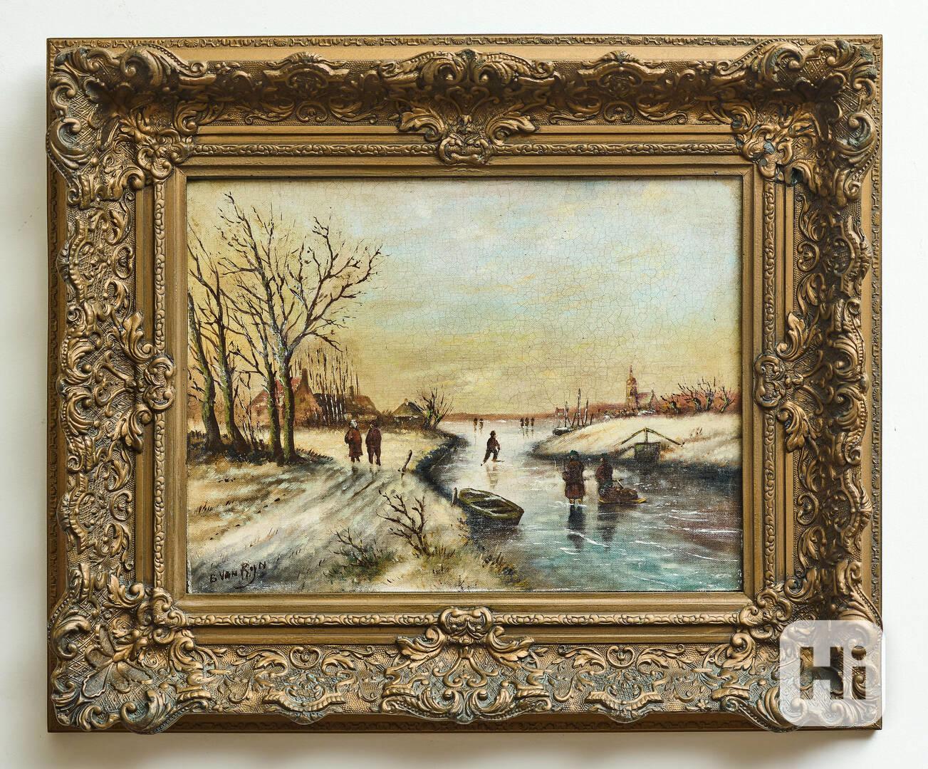 Olejomalba na dřevěné desce zachycující zimní krajinu s postavami kráčejícími podél zamrzlé řeky a s bruslaři na hladině. V popředí je malý člun přimrzlý u břehu, zasněžený terén a stromy bez listí. V pozadí jsou venkovské stavby a věž kostela, typické pro malířské pojetí severoevropské krajiny. Autentický charakter obrazu doplňuje jemná prasklinková struktura povrchu.