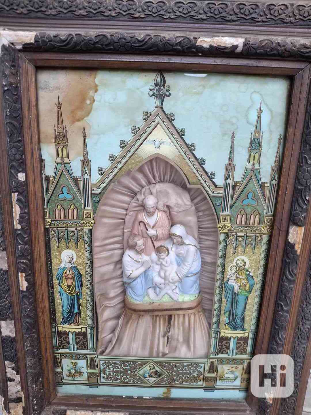 Nabízím k prodeji tento starožitný obraz s motivem svaté rodiny. Pravděpodobně vyroben na přelomu 19 až 20 století. Obraz je nutné restaurovat. Původní rám je dřevěný a poničený. Sklo je neporušené. Hrací mechanismus nebyl v obrazu nalezen. Stav obrazu viz. foto. Rozměry: výška 74cm. Šířka 54 cm. Cena 2000kc nebo dohodou.