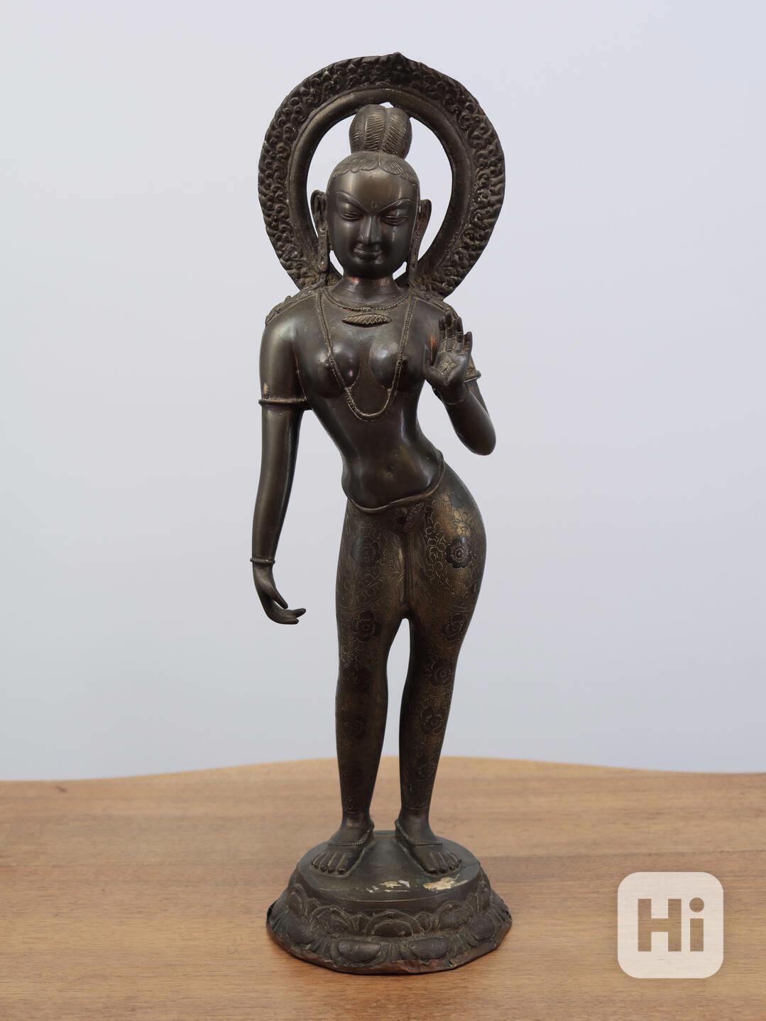Výrazná bronzová chrámová socha pocházející z Indie, zhotovená tradiční technikou odlévání. Postava je zobrazena v elegantním postoji s jemným esovitým prohnutím těla, typickým pro hinduistickou ikonografii. Pravá ruka je zdvižena v ochranném a žehnajícím gestu, levá paže je spuštěna podél těla. Hlava je lemována plastickým kruhovým nimbem a účes je proveden do vysokého uzlu.