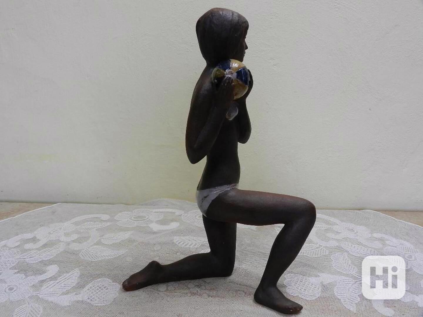 Krásná keramická plastika, Dívka s míčem, pálené hlína, kvalitní zpracování - Značeno, Znojmo Československo 1978.
