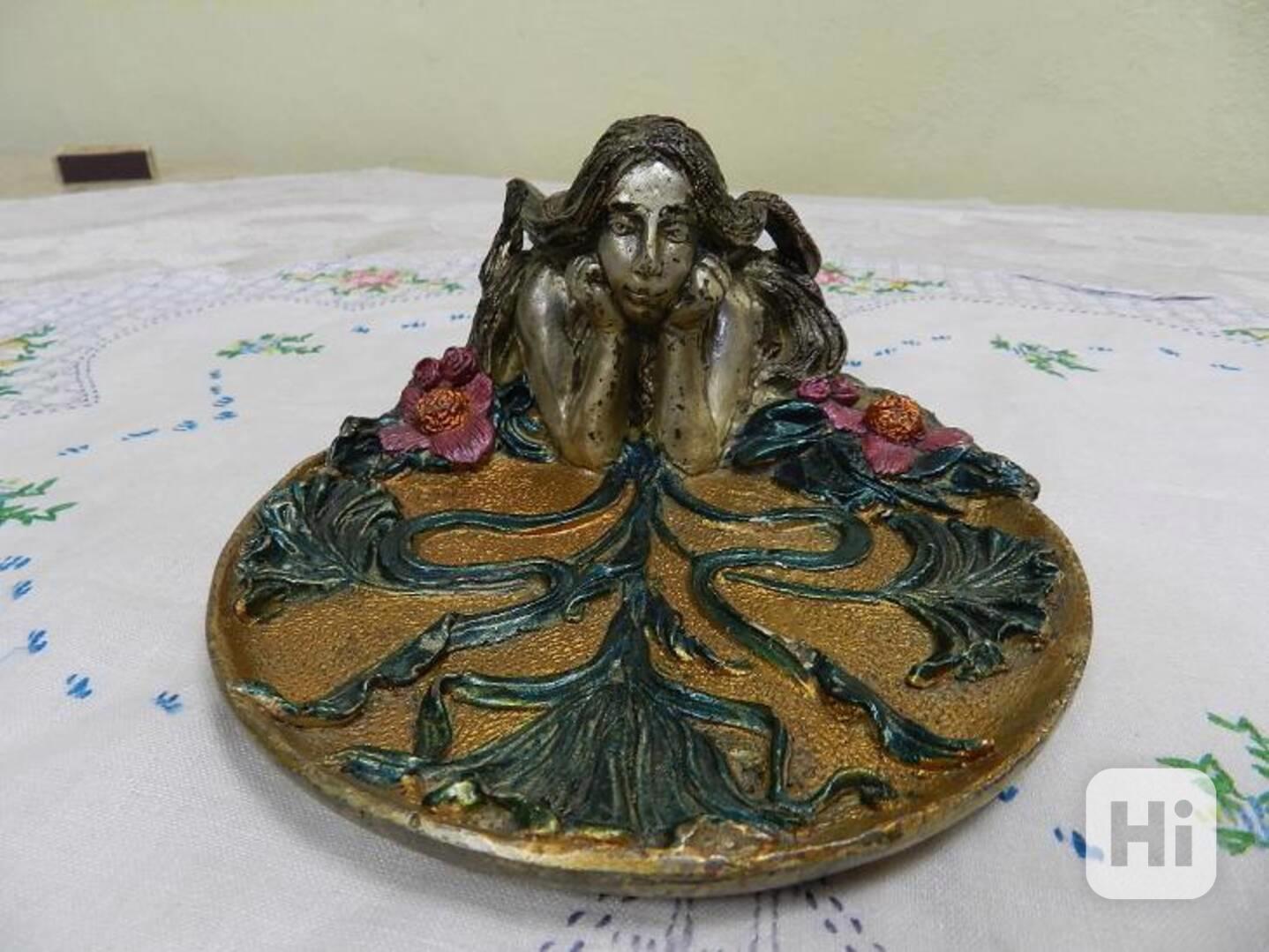 Zajímavá secesní kovová figurální plastika Panna