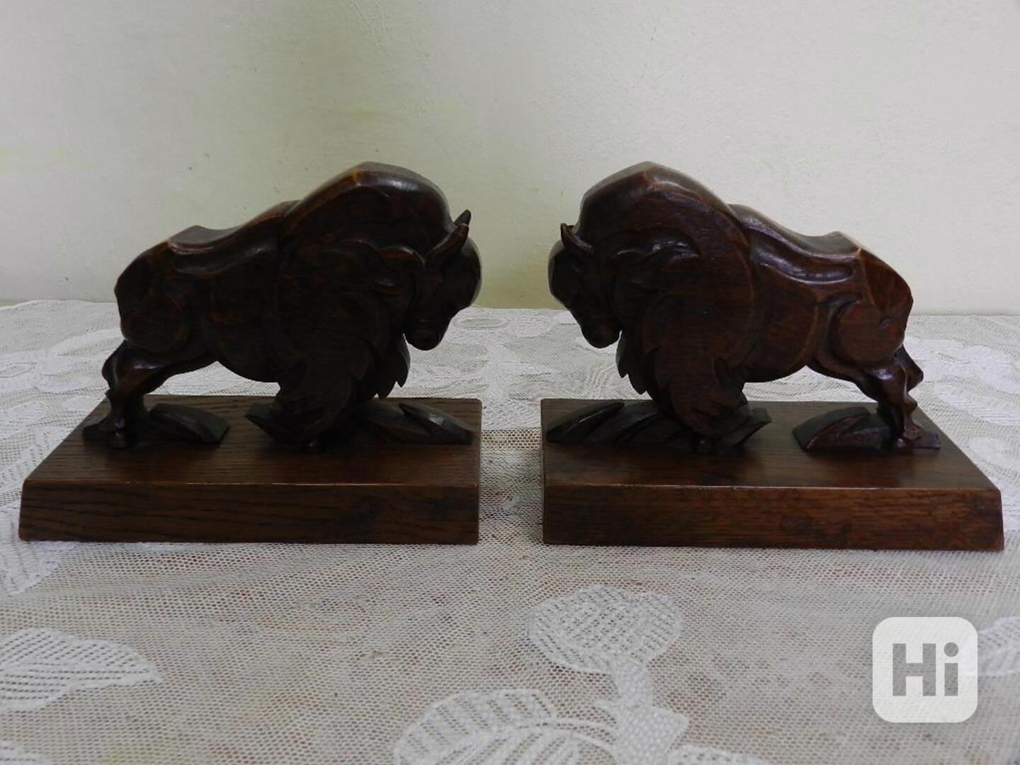 Kubistické dřevěné zarážky na knihy dřevořezba Bizon Zubr Bý