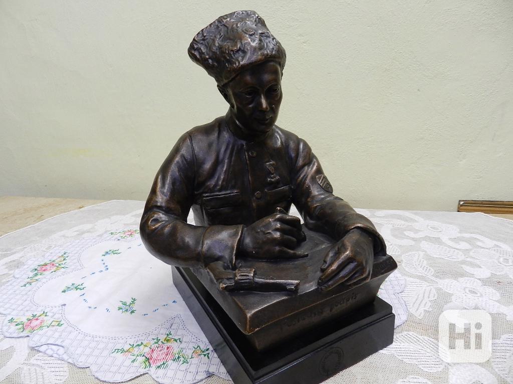 Socha Poslední Podpis, legionář plukovník Josef Jiří Švec(velitel 1 divize čs. legií v Rusku se v roce 1918 zastřelil, protože jeho vojáci odmítli splnit rozkaz k zastavení postupu bolševiků), patinovaná sádrová směs, dřevěný sokl, signováno, krásný stav.