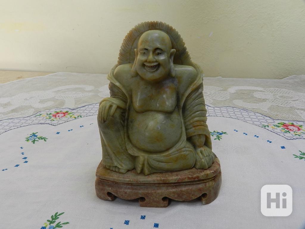 Hezká menší Soška, řezba, mastek, kamenný sokl, ruční práce, Budha - Shanghai.