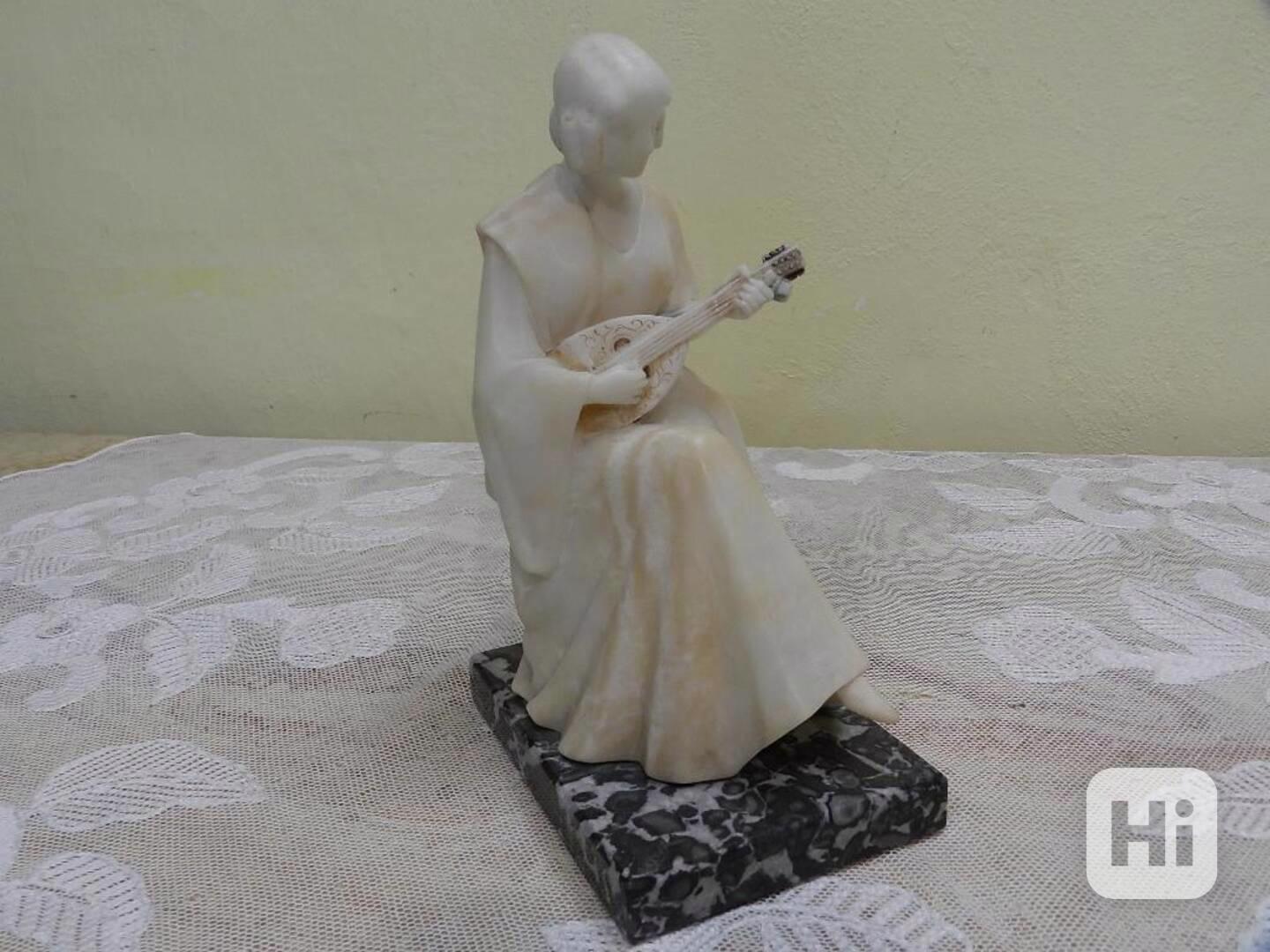 Hezká alabastrová soška, Sedící dívka s mandolínou, mramorový sokl - Signováno Schliepstein.