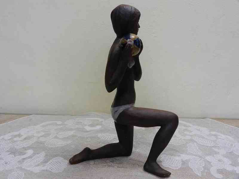 Krásná keramická plastika, Dívka s míčem, pálené hlína, kvalitní zpracování - Značeno, Znojmo Československo 1978.