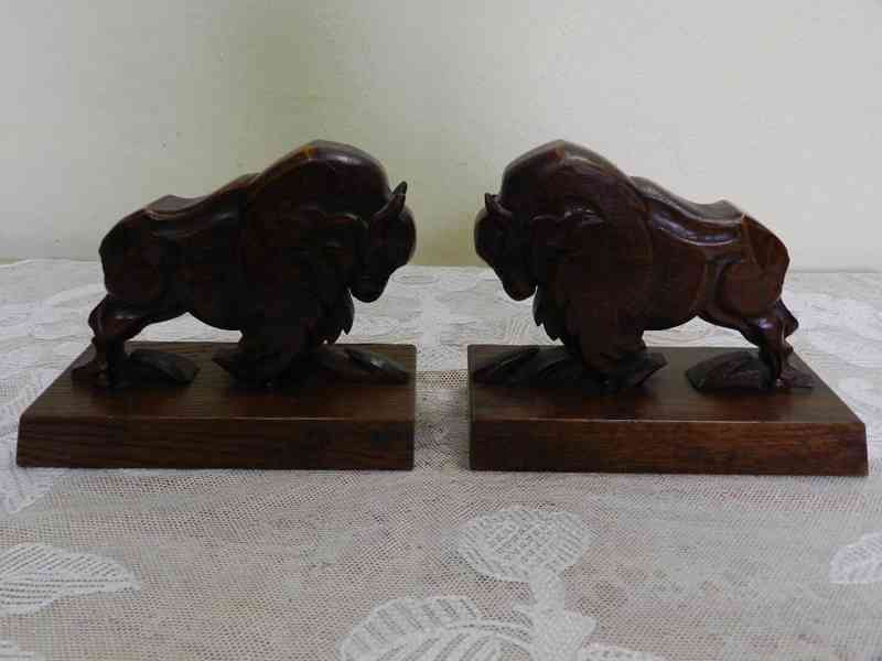 Krásné kubistické vyřezávané zarážky na knihy, Bizoni, lakované dřevo - Signováno na obou kusech, 1 třetina 20 stol.