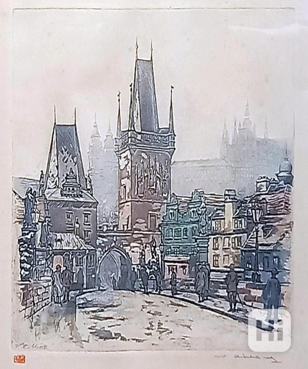 Prodám originální barevný lept od Vl.Röhlinga: Malostranské mostecké věže, rozměr 22x22 cm, nerámováno.