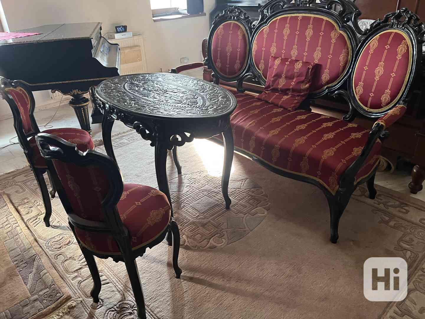 Nabizim starozitnou sedaci soupravu viz priloha., sklada se ze sedacky pro 3 osoby, stolku a 2 kresla.