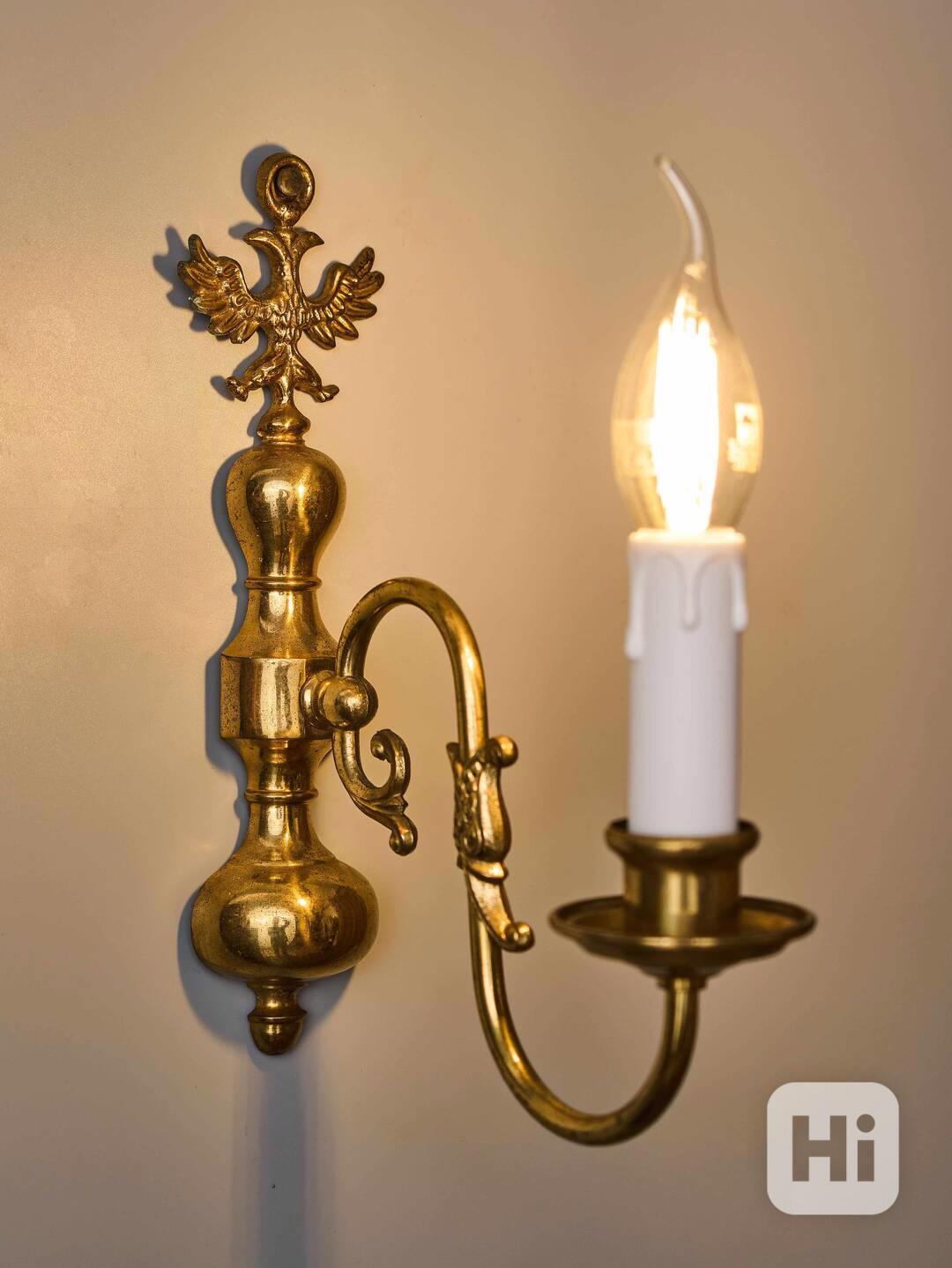 Nástěnná lampa z lité mosazi zdobená vrchní orlicí a rybou. Lampa byla vyrobená v polovině 20. století. Nyní je po renovaci elektroinstalace - v mědi, nová objímka a nová šešule (kryt objímky). Lampa je na jednu klasickou svíčkovou žárovku s paticí E14 do 40W - vhodné jsou normální, halogenové i led žárovky. Stav: restaurovaný - plně funkční. Provenience: Nizozemí.