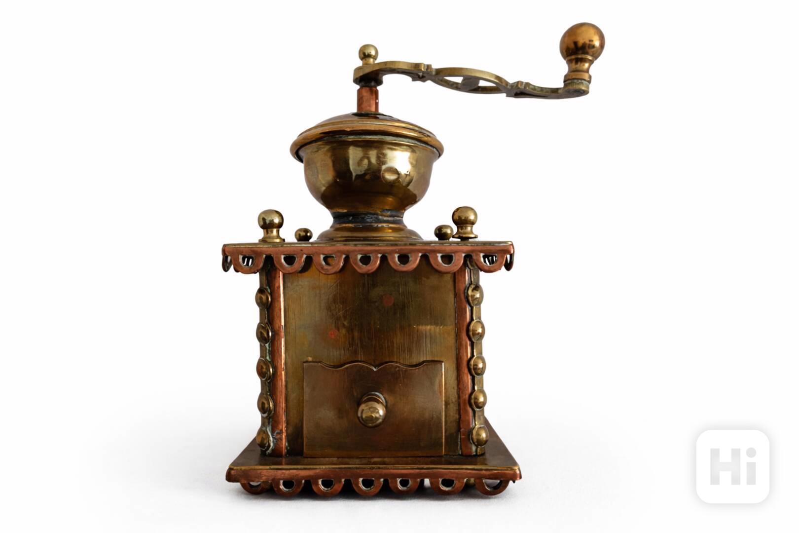 Zajímavý velmi starý mosazný mlýnek na kávu, bohatě a detailně zdobený ze všech stran – viz přiložené fotografie. Působivý historický kus, který se bude krásně vyjímat jako dekorace nebo ve sbírce starožitností.