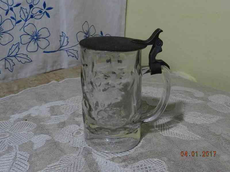 Starý masivní skleněný korbel mosazný poklop, cejch 0,3l.
