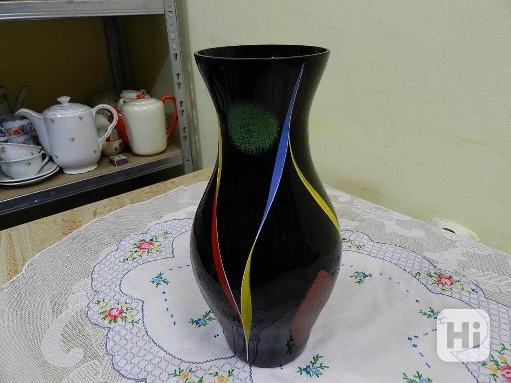 Hezká černá Váza, barevný stříkaný dekor.