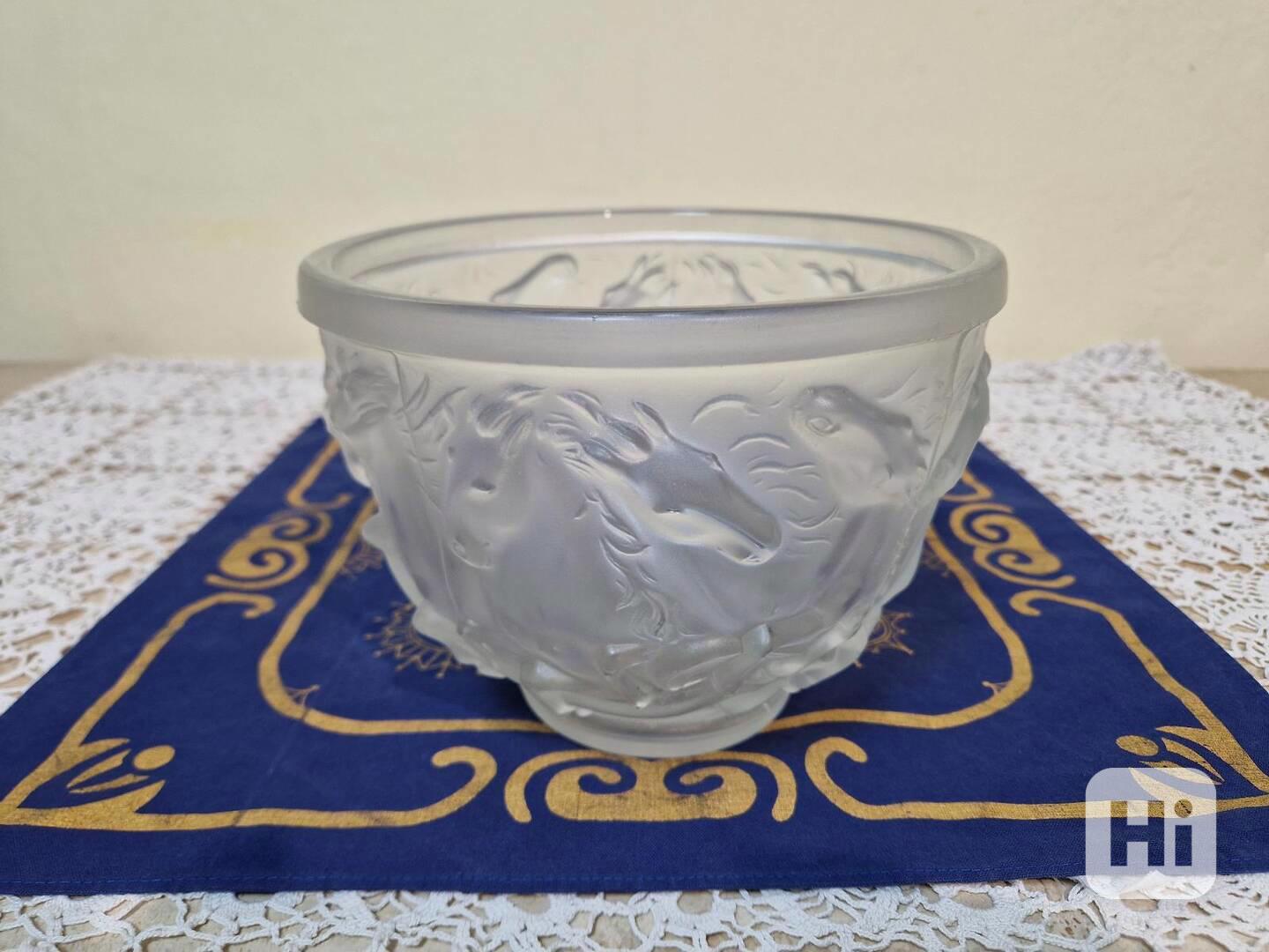 Krásný Art Deco, vysoce reliéfní a špičkově zpracovaný obal na květináč ve stylu Lalique, 12 koní po celém obvodu, čiré matované sklo - Schlevogt, Jablonec, 30 léta 20 stol.Rozměry: výška 15,5cm, průměr 20cm.