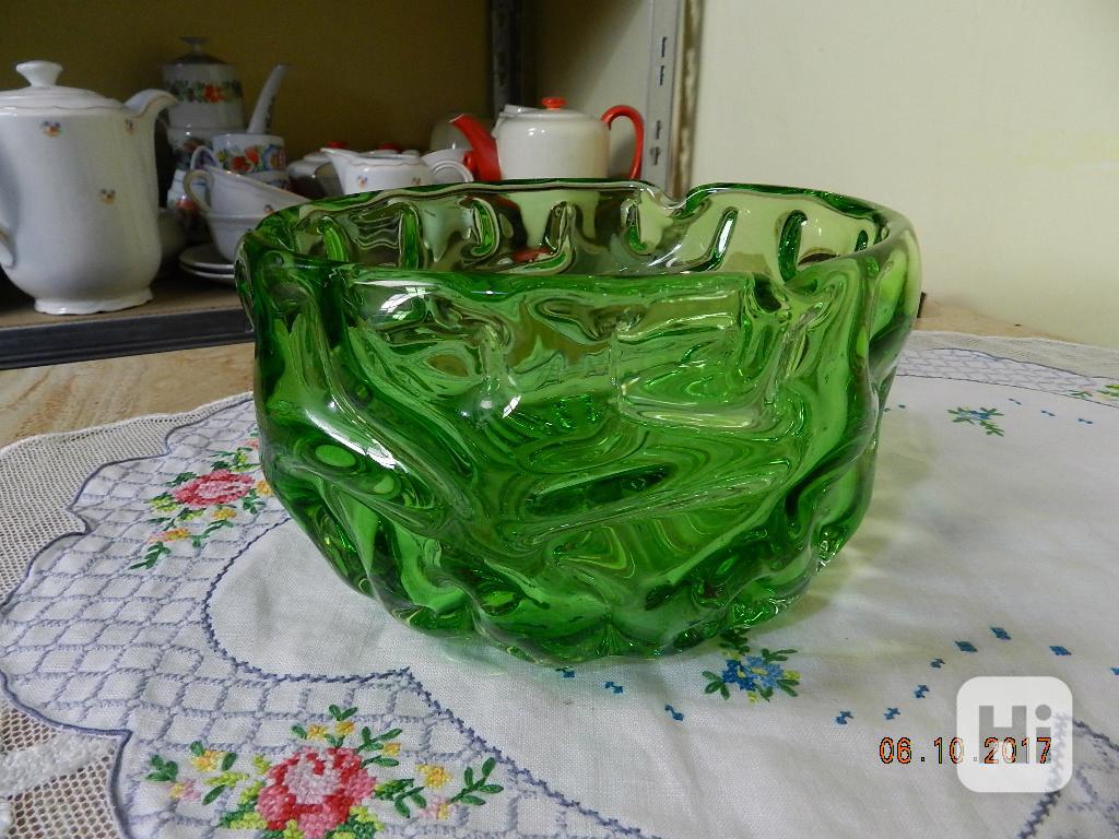 Krásná zelená Mísa či Popelník, Hutní sklo - Pavel Hlava, Nový Bor, 60 léta 20 stol.