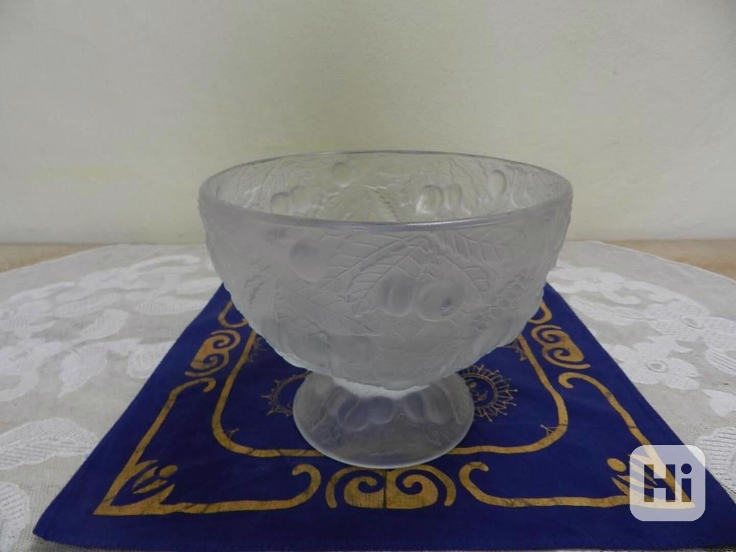 Krásná masivní mísa na noze ve stylu Art Deco, Barolac, motivy třešní, plastický reliéf, čiré matované sklo - Čechy, Josef Inwald, 1949-1952.