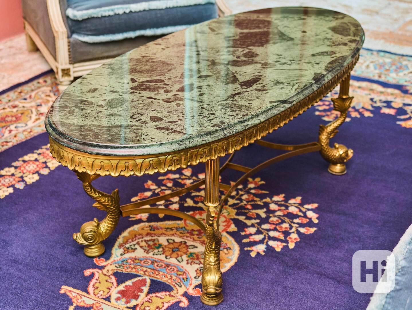 Těžký a stabilní. Bohatě zdobené tělo z lité mosazi. Vrchní deska z francouzského mramoru s fasetou. Výborný stav - deska je nově rozleštěná v dílně uměleckého kameníka.