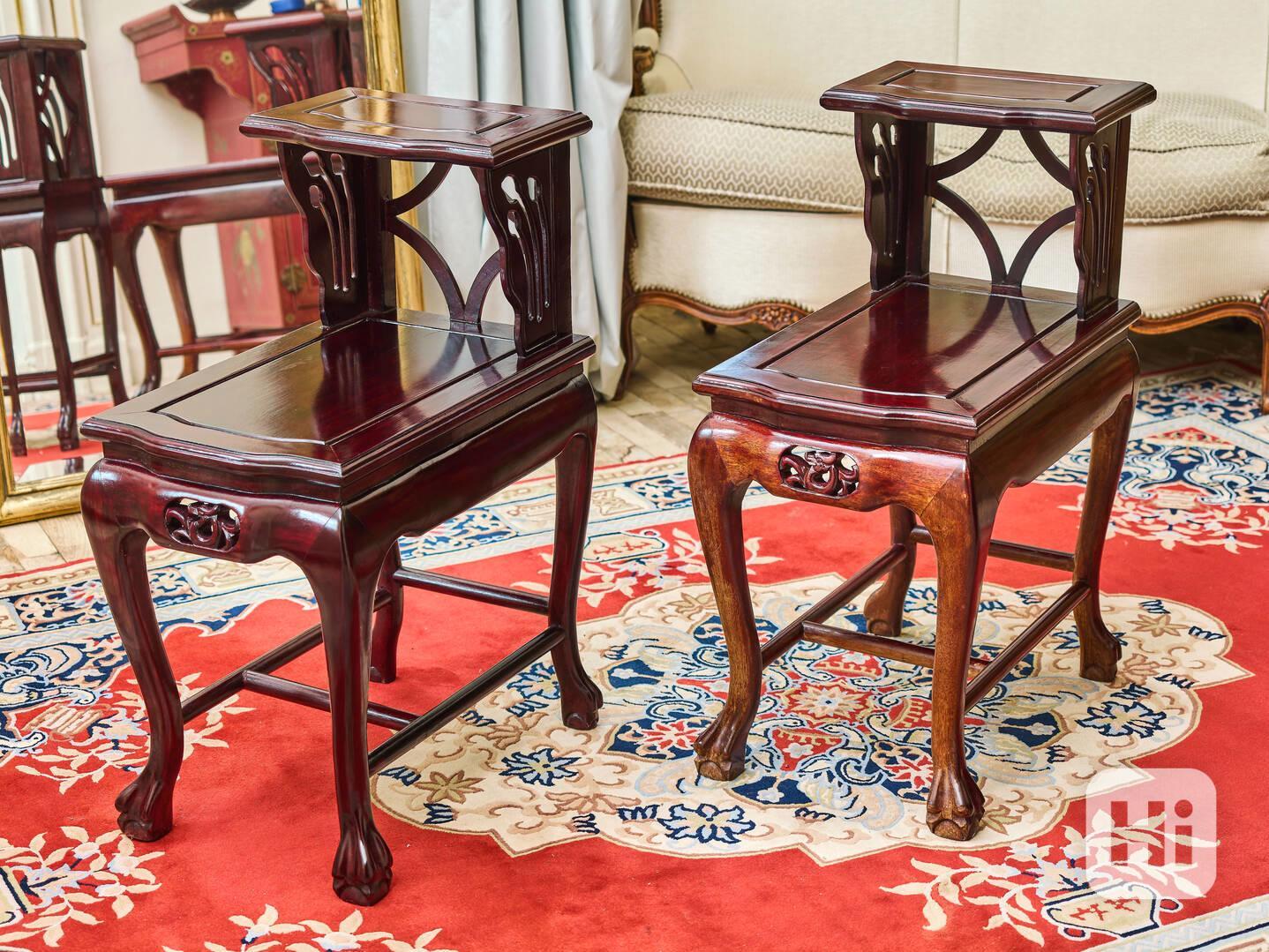 Elegantní pár čínských stolků z masivního tvrdého dřeva, ručně vyřezávaný v tradičním stylu. Stolky mají jemně profilované nohy, boční výplně s obloukovým dekorem a plastickou řezbu v čelních partiích. Povrch je ručně leštěný do hlubokého, teplého lesku, který zvýrazňuje kresbu dřeva.