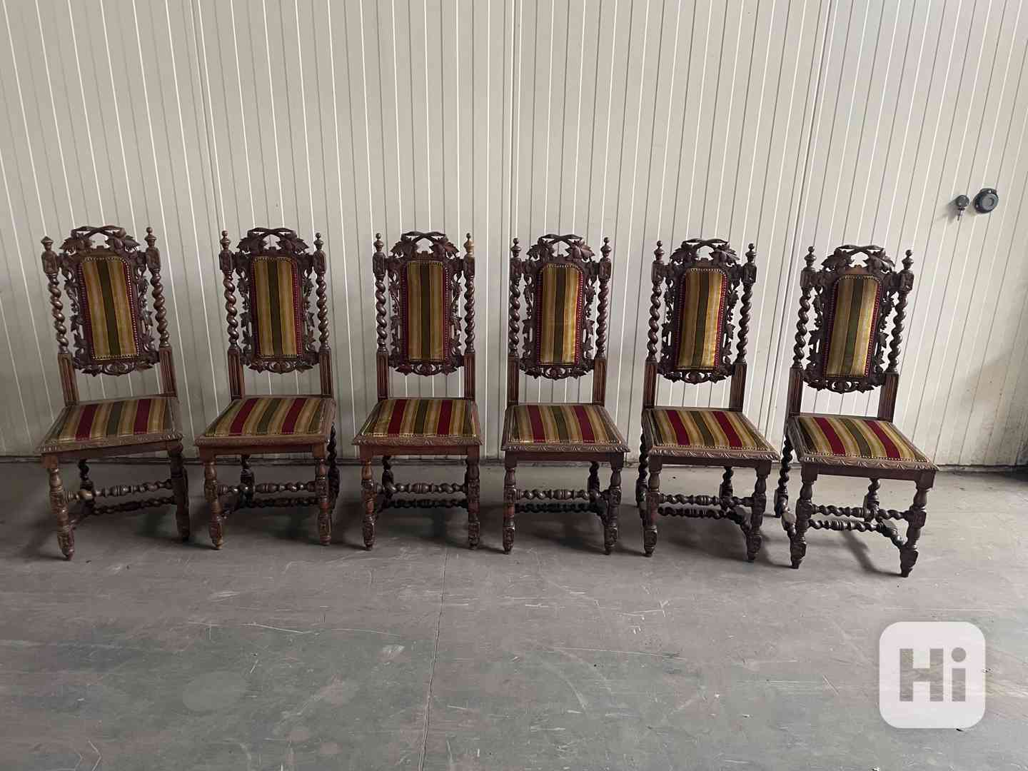 113 Rustikální rozkládací dřevěný stůl a 6 židlí - masiv
