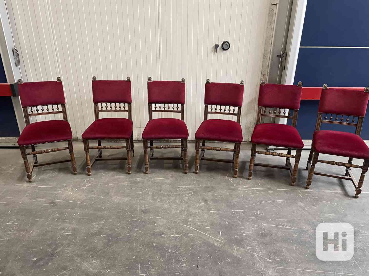 113 Rustikální rozkládací dřevěný stůl a 6 židlí - masiv