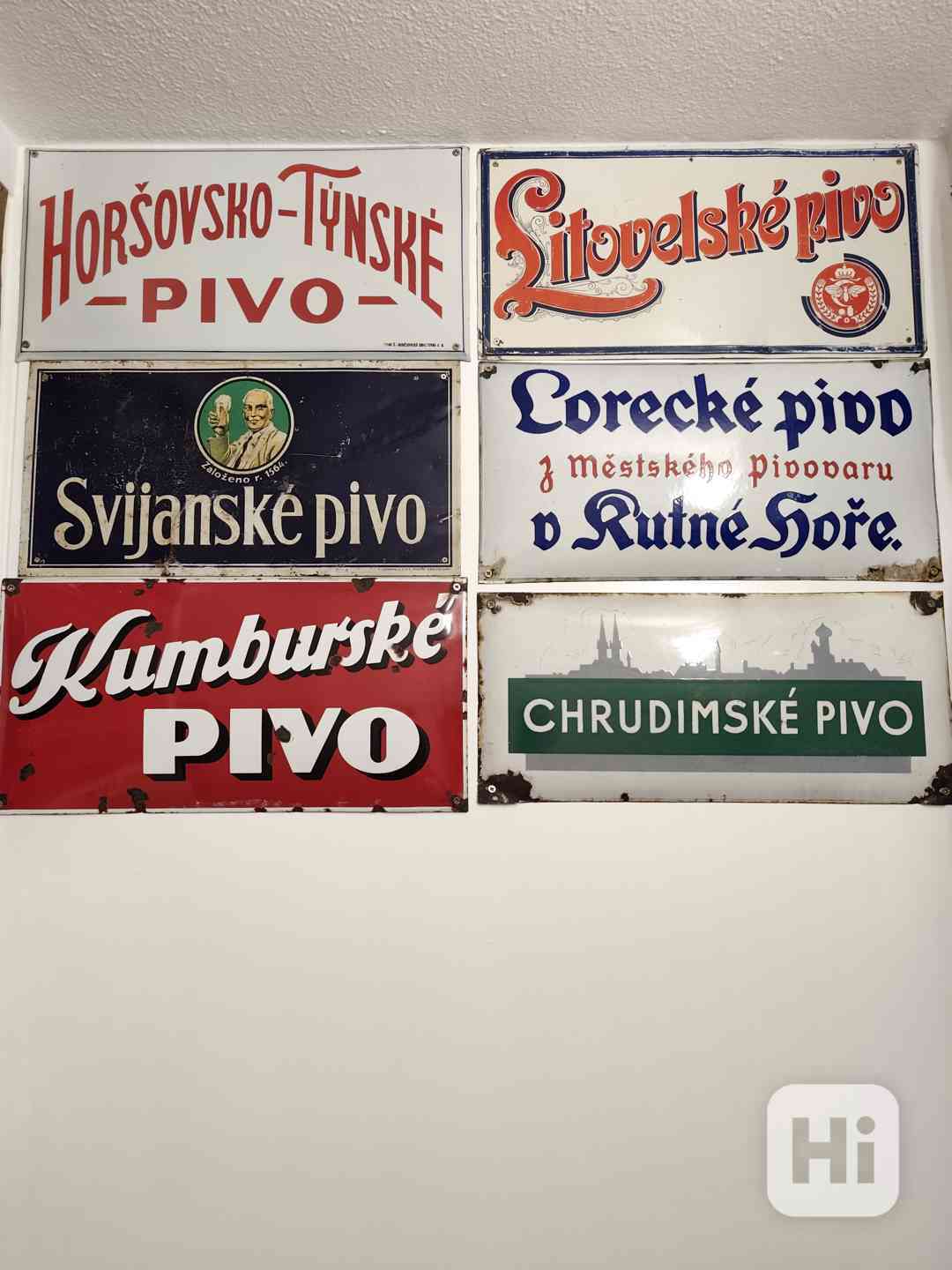 Pivní sklo, půllitry, třetinky, pivovarské cedule.
