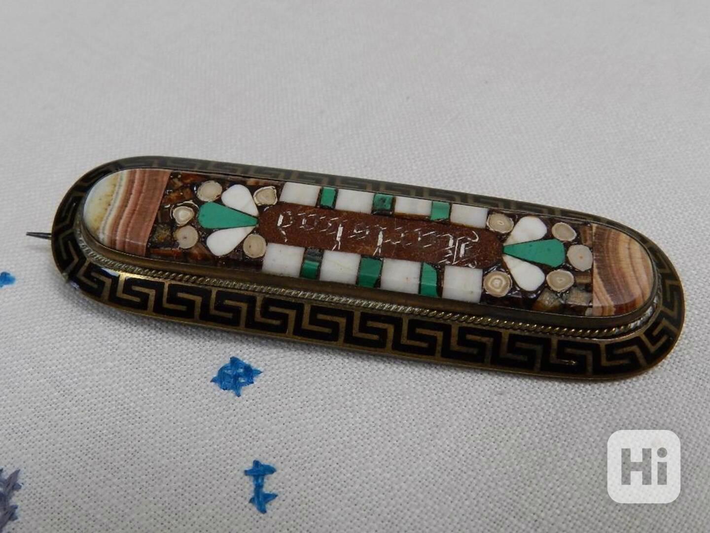 Brož karlovarská mozaika v tombaku, vřídlovec, malachit, smalty, Karlsbad - Karlovy Vary, 19/20 stol.Rozměry: délka tělo 7,5cm, s jehlicí 8cm.
