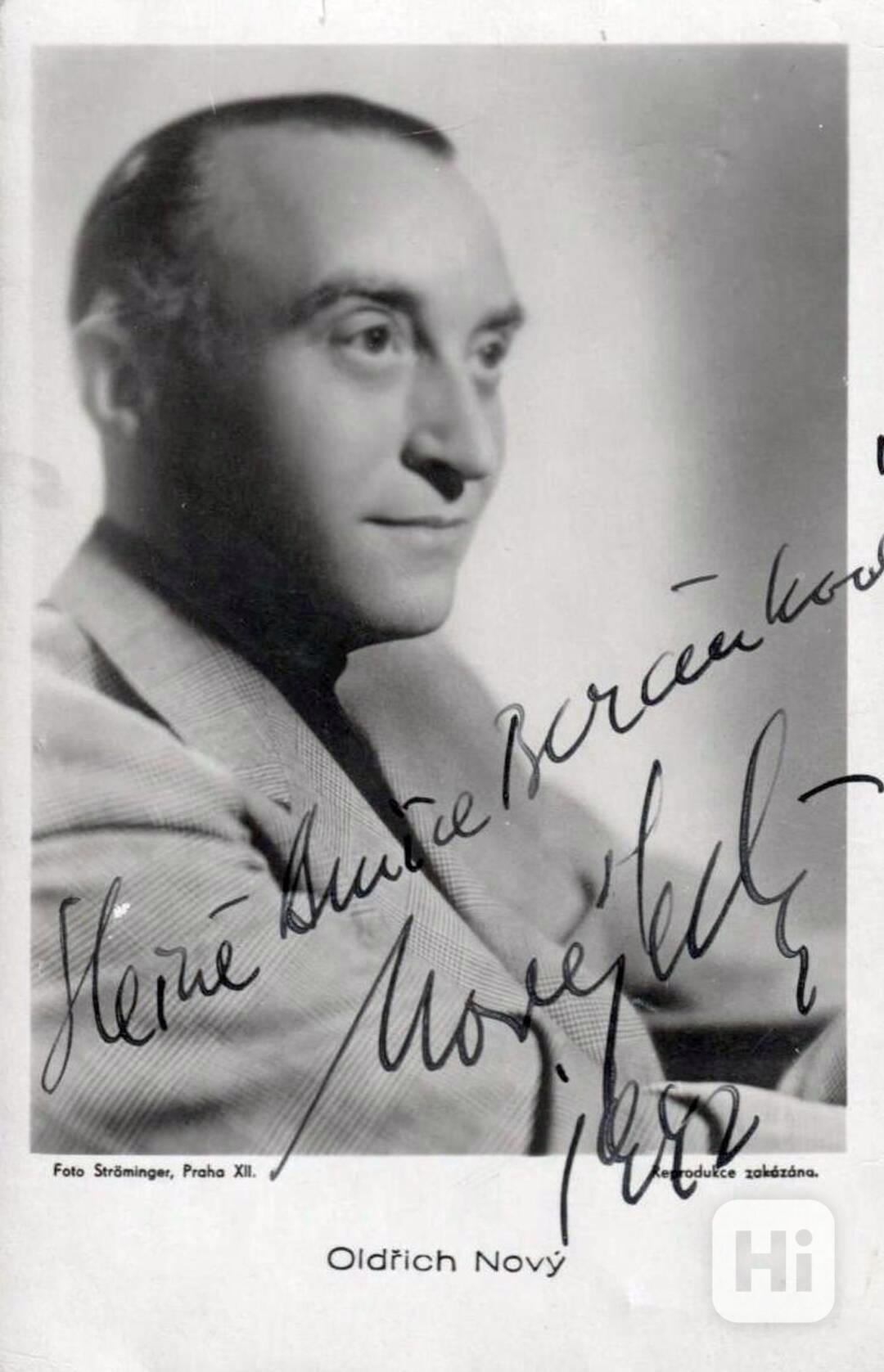 Antikvární portrétní pohlednice s vlastnoručním podpisem a osobním věnováním jednoho z nejvýznamnějších herců první republiky, Oldřicha Nového. Pohlednice má rozměry 14 x 9 cm. Fotografie vznikla v druhé polovině 30. let 20. století v renomovaném pražském uměleckém ateliéru Willi Strominger, který úzce spolupracoval s tehdejšími filmovými ateliéry AB Barrandov. Tento ateliér se stal vyhledávaným místem pro mnohé hvězdy prvorepublikového filmu, které zde pořizovaly své profesionální portréty.