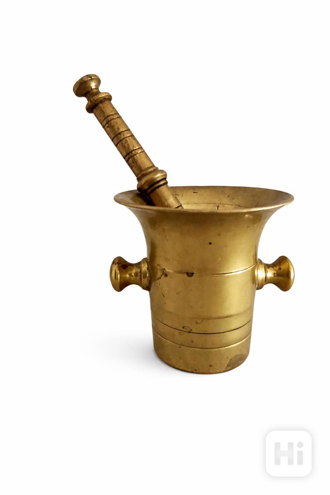 Nabízím starý mosazný hmoždíř s tloukem č. 8, vyrobený z masivní mosazi. Tento krásný kus vyniká poctivým zpracováním, příjemnou patinou a solidní váhou 1,6 kg, která zaručuje stabilitu při používání i působivý dekorativní vzhled.