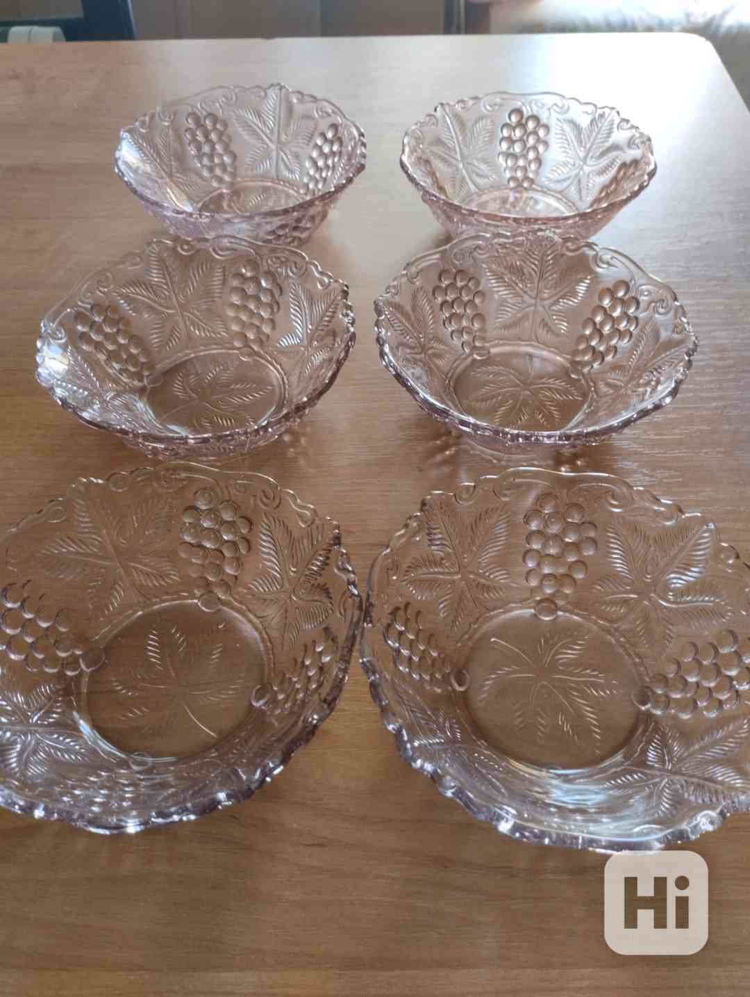 Retro kompotová sada 6ti kusů lisovaného fialového skla průměr 14 cm,výška 4/5 cm nepoškozené cena 840-kč+zásilkovna